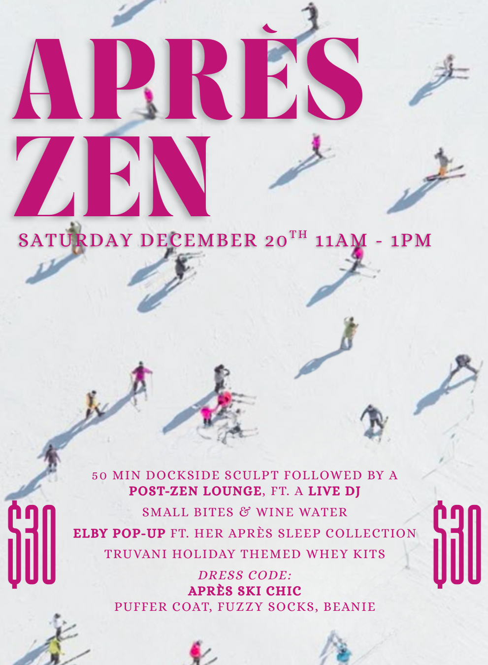 Join us for a 50 minute sculpt class taught by Maddie and Megan, followed by a live DJ, Elby Pajama pop-up, and so much more! Experience the Zen Bar way and leave with a goodie bag full of our favorite products.
